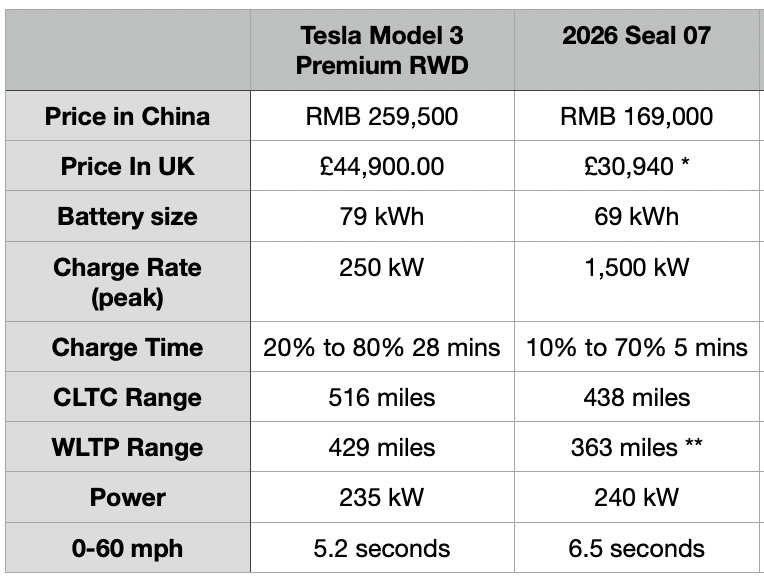 But BYD hasn’t put this in some silly, expensive flagship halo car. No, the Seal 07 is a mass-market Model 3 competitor. I have compared the two in the table below:
